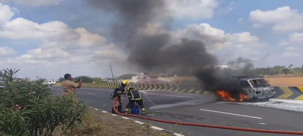 கரூர் – திருச்சி தேசிய நெடுஞ்சாலை மேம்பாலத்தில் ஓடிக் கொண்டிருந்த ஆம்னி வேன் திடீரென தீ பற்றி எரிந்ததால் பரபரப்பு ஒரே குடும்பத்தைச் சார்ந்த நான்கு பேர் அதிஷ்டமாக உயிர் தப்பினர். – தீயணைப்பு வீரர்கள் போராடி தீயை அணைத்தனர்.