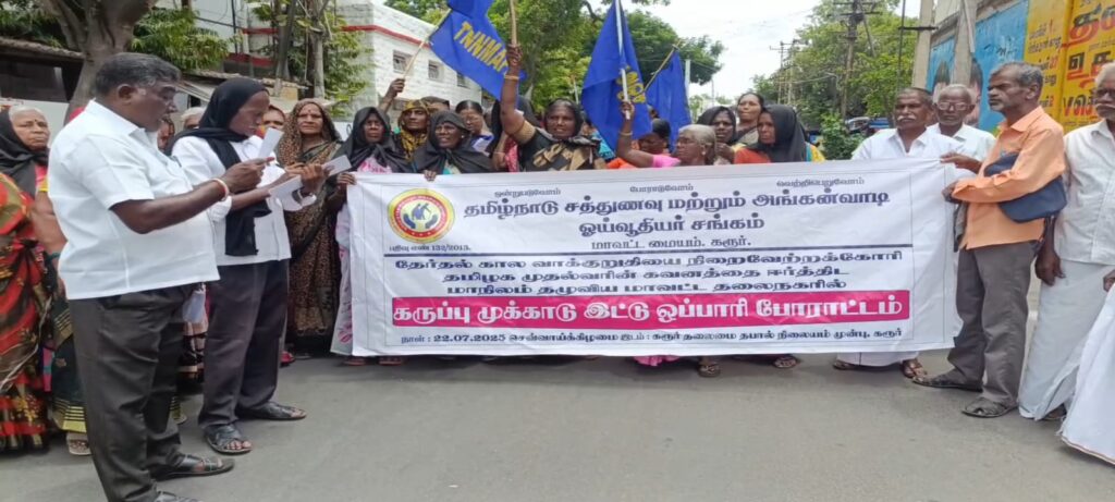 தமிழ்நாடு சத்துணவு மற்றும் அங்கன்வாடி ஓய்வூதியர் சங்கம் சார்பில் தேர்தல் காலங்களில் கொடுத்த வாக்குறுதியை நிறைவேற்ற கோரி தமிழக முதல்வரின் கவனத்தை ஈர்த்திட மாநிலம் தழுவிய மாவட்ட தலைநகரங்களில் கருப்பு முக்காடு இட்டு ஒப்பாரி போராட்டம் கரூர் தலைமை தபால் நிலையம் முன்பு நடைபெற்றது.