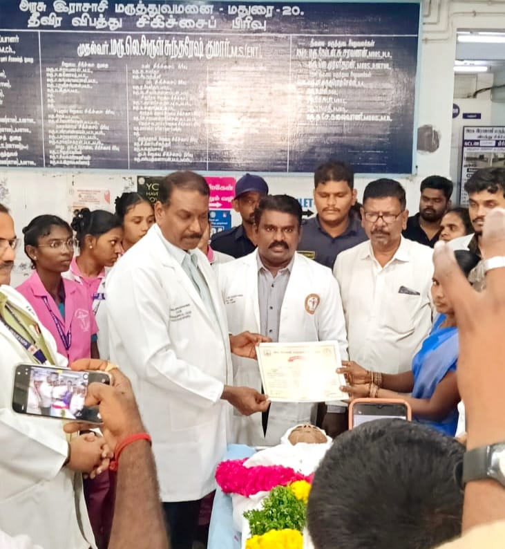 இதுகுறித்து மருத்துவமனை முதல்வர் அருள் சுந்தரேஷ் குமார் கூறுகையில், தீவிர விபத்து சிகிச்சைப் பிரிவில் உடற்கூராய்வுக்குப் பின் அரசு இராஜாஜி மருத்துவமனையின் நிர்வாகம் சார்பாக இறுதி மரியாதை செய்யப்பட்டு அவரது குடும்பத்தாரிடம் காவல்துறையின் மூலம் உடல் ஒப்படைக்கப்பட்டது. மேற்கண்ட நபரின் உடல் உறுப்பு தானத்தால் ஏழு நபர்கள் பயன் பெற்றுள்ளனர். உடல் உறுப்பு தானம் செய்தவருக்கு தமிழக அரசு சார்பாக இறுதி மரியாதை செய்வதற்காக கரூர் மாவட்ட நிர்வாகத்திடம் அன்னாரின் உடல் உரிய மரியாதையுடன் அனுப்பி வைக்கப்பட்டது.