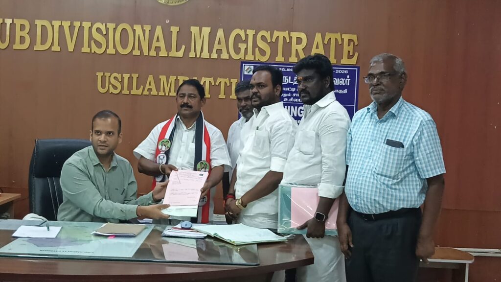 உசிலம்பட்டி தொகுதியில் போட்டியிடும் அனைத்திந்திய புரட்சித்தலைவர் மக்கள் முன்னேற்ற கழகத்தின் வேட்பாளர் பி.அய்யப்பன் இன்று தனது வேட்புமனுவை தேர்தல் நடத்தும் அலுவலர் உத்கர்ஷ்குமாரிடம் வழங்கினார்.,
