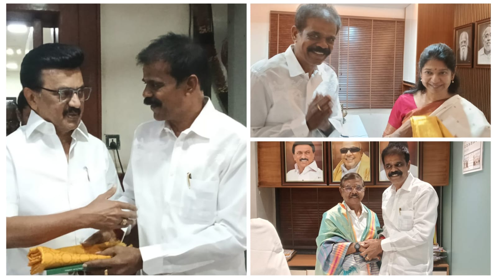 தமிழ்நாடு முதலமைச்சர் மு.க.ஸ்டாலின், திமுக துணைப் பொதுச்செயலாளர் கனிமொழி எம்.பி., திமுக துணை அமைப்பு செயலாளர் எஸ்.ஆஸ்டின் ஆகியோரை சந்தித்து, வாழ்த்து பெற்ற மாநில திமுக வர்த்தகர் அணி துணை அமைப்பாளர் பி.டி.செல்வகுமார்.