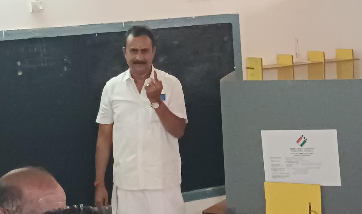 குடும்பத்தினருடன் வந்து வாக்கு செலுத்திய எஸ்.பி.வேலுமணி..,