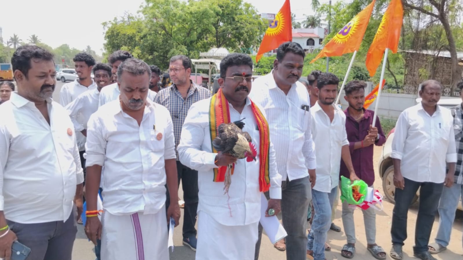 சேவலுடன் வேட்புமனு தாக்கல் செய்ய வந்த வேட்பாளர் ப.குணாவால் பரபரப்பு..,