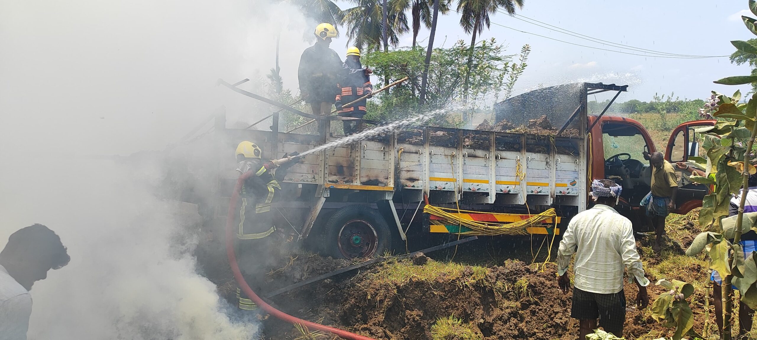 மின்கம்பி உரசி தீ பிடித்த எரிந்த வைக்கோல் லாரி..,