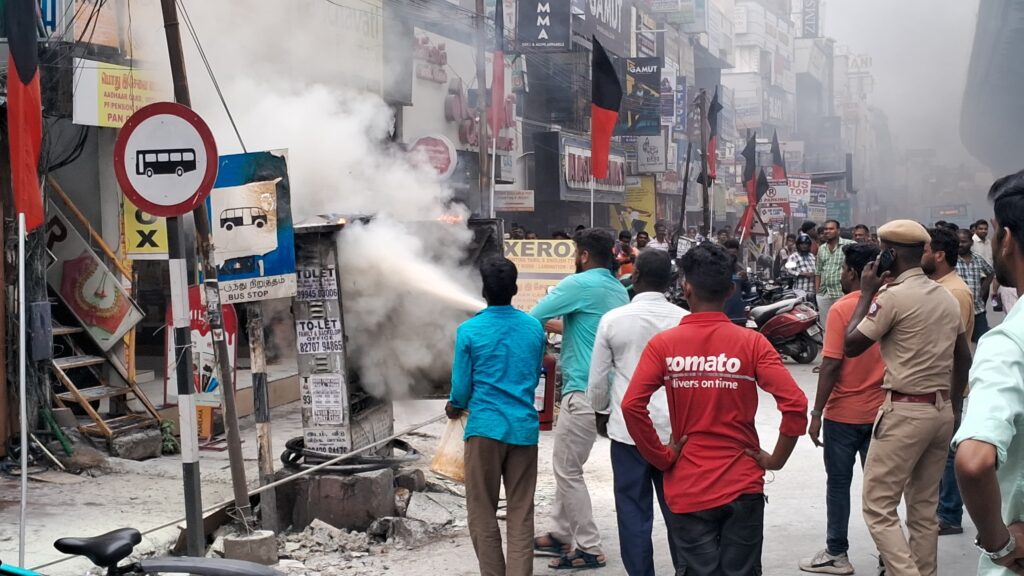 சிறிது நேர போராட்டத்திற்குப் பின் தீ முழுமையாக அணைக்கப்பட்டது. இந்த விபத்தில் யாருக்கும் எந்த காயமும் ஏற்படவில்லை. மின்வாரிய பெட்டியில் ஏற்பட்ட மின்கசிவு காரணமாகவே இந்த தீ விபத்து ஏற்பட்டதாக முதற்கட்ட விசாரணையில் தெரியவந்து உள்ளது. மின்சாரத் துறையினர் இதுகுறித்து தொடர்ந்து விசாரணை நடத்தி வருகின்றனர். இந்த சம்பவத்தால் அப்பகுதியில் சிறிது நேரம் போக்குவரத்து பாதிப்பு ஏற்பட்டது. தீ அணைக்கப்பட்ட பின் போக்குவரத்து சீரானது.