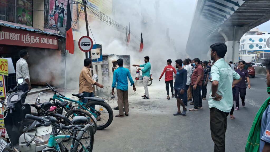 மின் கடத்தி பெட்டி தீப்பிடித்து எரிந்ததால் பேருந்துக்காக காத்து இருந்த பயணிகள் அலறி அடித்து ஓட்டம்..,