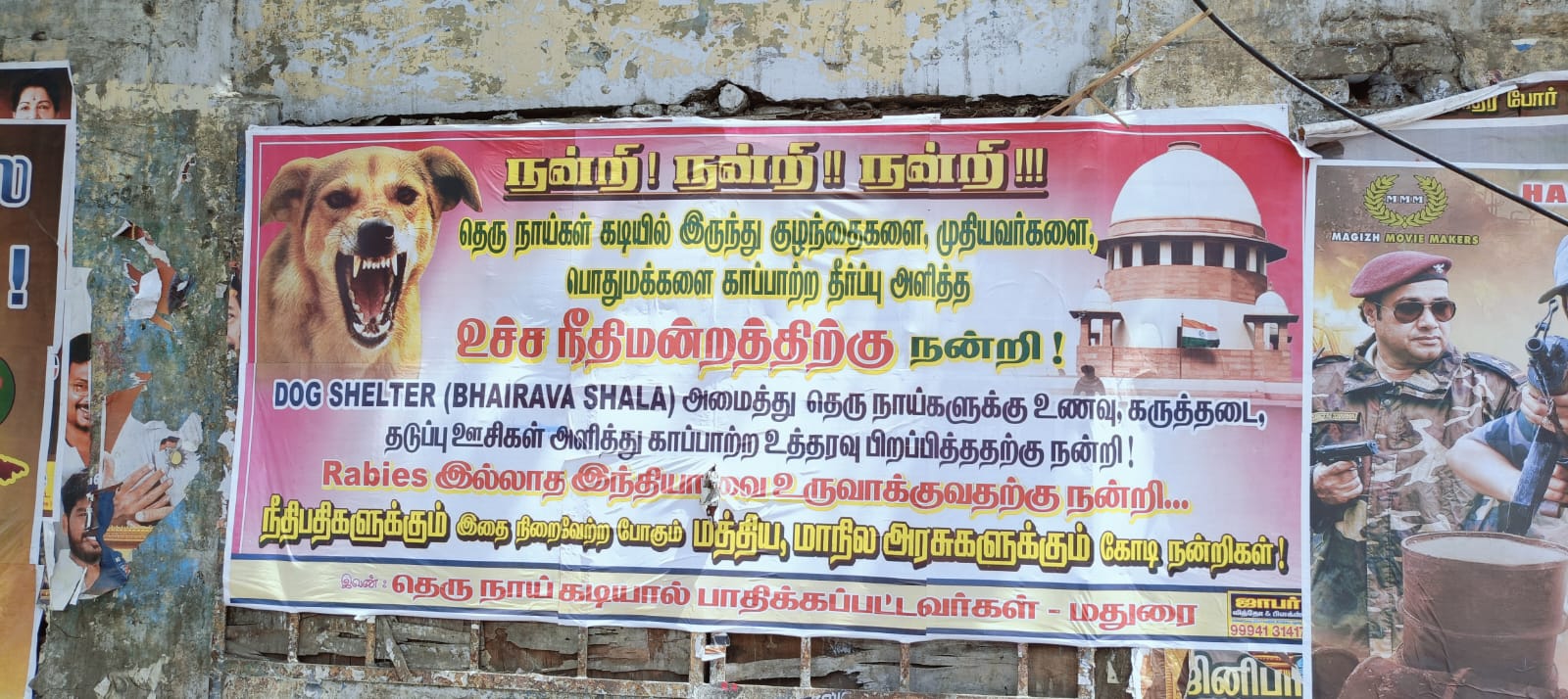 நாளுக்கு நாள் தங்களுடைய அன்றாட நிகழ்வுகளையும் சுப நிகழ்வுகளையும் போஸ்டர் அடித்து ஒட்டுவதில் மதுரைக்காரர்களுக்கு நிகர் மதுரைக்காரர்கள் மட்டுமே , இந்த நிலையில் நன்றி நன்றி நன்றி என்று குறிப்பிட்டு தெரு நாய்கள் கடியில் இருந்து குழந்தைகளை முதியவர்களை பொதுமக்களை காப்பாற்ற தீர்ப்பளித்த உச்சநீதிமன்றத்திற்கு நன்றி.