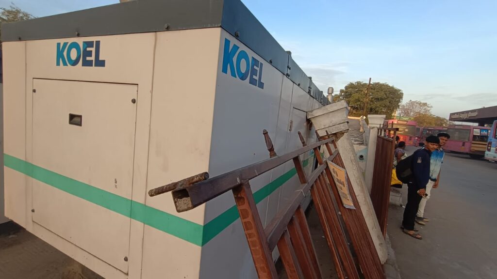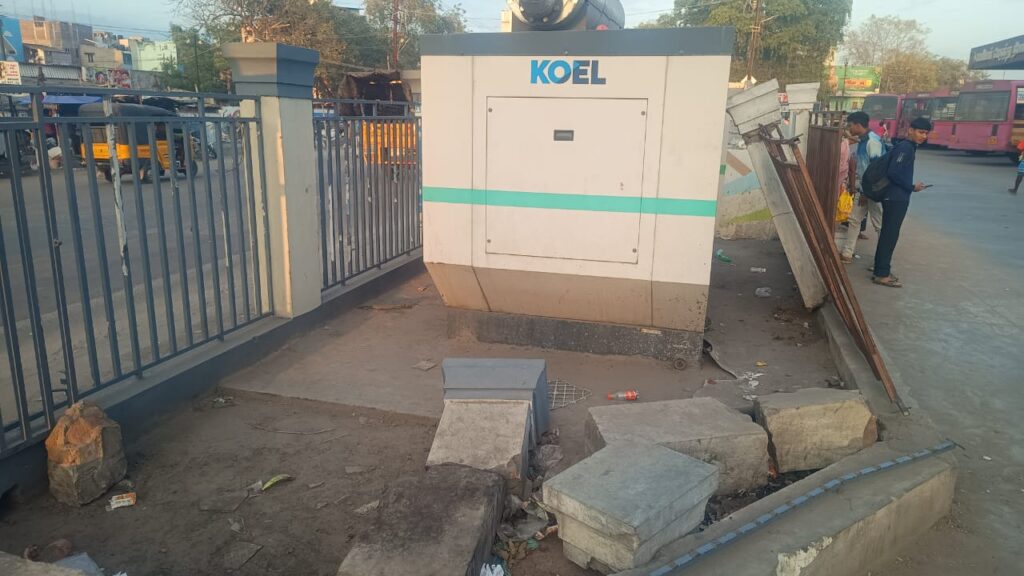 இந்த ஸ்மார்ட் சிட்டி பேருந்து நிலையம் முறையாக பராமரிக்கப்படாமல் இருப்பதால் பேருந்துகள் வெளியே செல்லக்கூடிய பகுதிகளில் வைக்கப்பட்டிருக்கக்கூடிய ஜெனரேட்டர் மீது சுற்றுச்சுவர் சாய்ந்த படி உள்ளது. கடந்த ஒரு மாதத்திற்கு மேலாக இந்த சுவர் இடிந்து ஜெனரேட்டர் மீது உள்ளதை அதிகாரிகள் யாரும் அகற்றி சுவரை சீரமைக்கவில்லை.