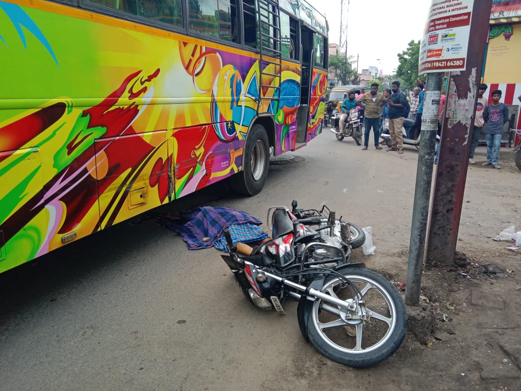 அப்பொழுது ஆரப்பாளையம் பேருந்து நிலையத்திலிருந்து சின்னமனூர் செல்லக்கூடிய தனியார் ஒரே திசையில் வந்து கொண்டிருந்தது. அப்பொழுது மஞ்சள் மேடு என்கின்ற பகுதிக்கு அருகே வரும் பொழுது இருசக்கர வாகனம் வலது புறமாக திரும்பியதில் இவர் நிலை தடுமாறி வலது புறம் கீழே விழுந்தால் அப்பொழுது பேருந்தில் பின் சக்கரம் அவர் மீது ஏறி இறங்கியதில் அவர் நிகழ்விடத்திலேயே உயிரிழந்தார்.