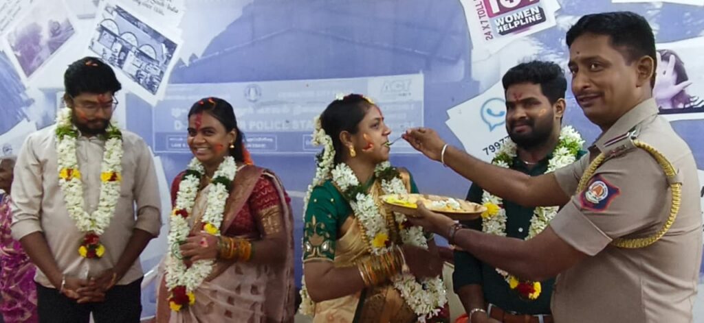 நிகழ்ச்சியில், இரு தம்பதியினரும் மரியாதையுடன் அமர்த்தப்பட்டு, காவல்துறை அதிகாரிகள் அவர்களுக்கு பாரம்பரிய முறையில் பட்டு சேலை ,வேட்டி சட்டை பழங்கள்