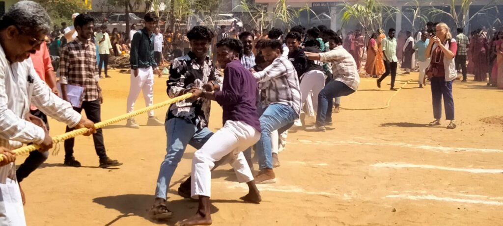 வடம் இழுக்கும் போட்டியில். சிறப்பு விருந்தினர்கள் காட்டிய உற்சாகம் வேகத்தில் மாணவர் பகுதி தோல்வி கண்டதும் கூடி நின்று வடம் இழுக்கும் போட்டியை உற்சாகமாக பார்த்த மாணவர்கள், விருந்தினர்கள் கூட்டம் உற்சாகம் மிகுதியில்’ கை’ ஒலி எழுப்பி வெற்றிபெற்ற அணியினரை மகிழ்வித்தார்கள்.