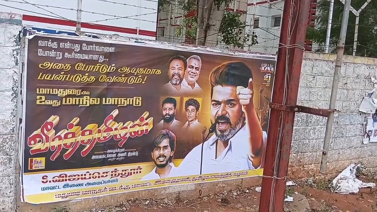 இந்நிலையில் மாநாடுக்கு தொண்டர்கள் விஜயை வரவேற்கும் விதமாக மதுரை தமிழக வெற்றி கழக தொண்டர்களால் மதுரையின் முக்கிய பகுதிகளில் ஒட்டப்பட்ட போஸ்டர்களால் பெரும் பரபரப்பு.
