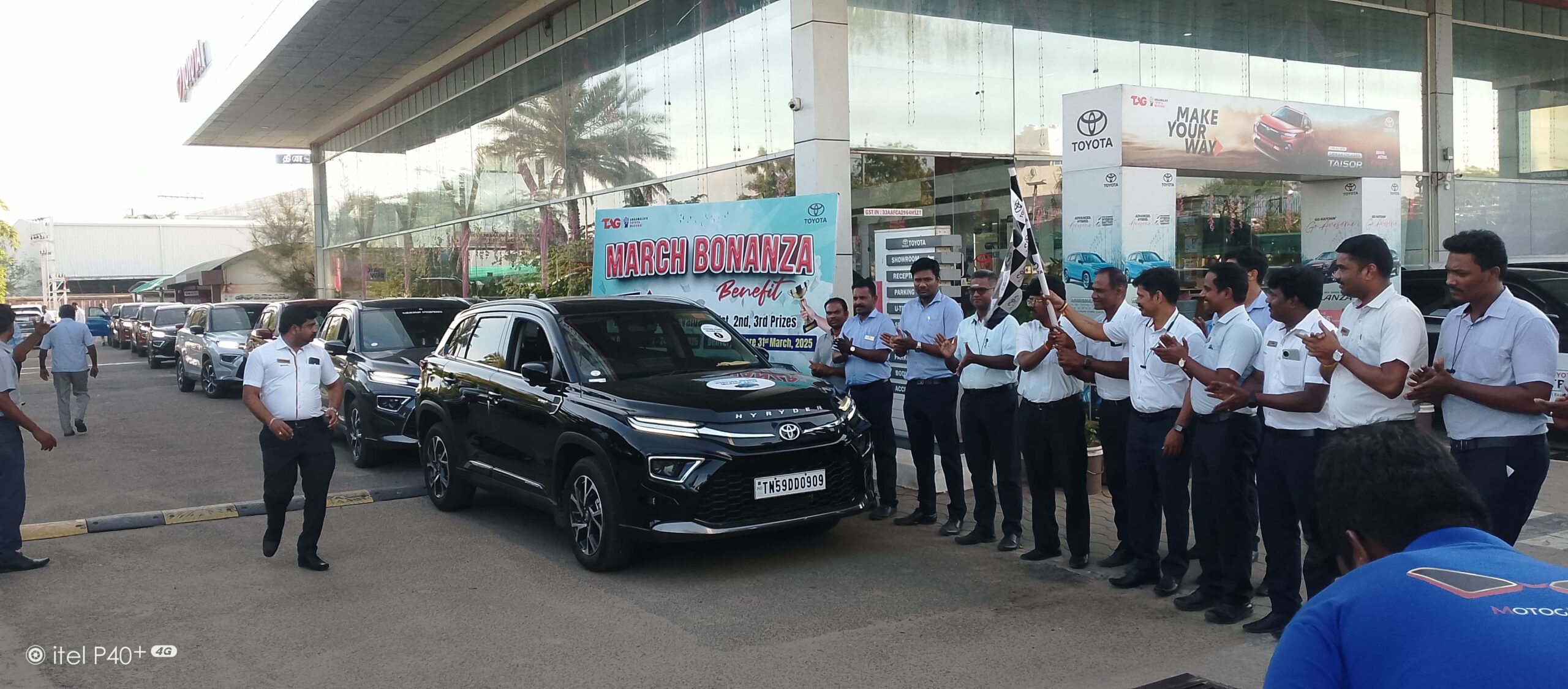 ஆனைமலைஸ் டொயோட்டா மதுரை கப்பலூரில் HYRYDER-HYBRID RALLY ( கார் அணி வகுப்பு) நடைபெற்றது. இந்த அணிவகுப்பில் சுமார் 13 டொயோட்டா வாகனங்கள் கலந்து கொண்டன. இதில் 20 வாடிக்கையாளர்கள் பயணம் செய்தனர் இந்த அணி வகுப்பு ஆனைமலைஸ் டொயோட்டா நிறுவனத்தில் இருந்து ஏர்போர்ட் ரிங் ரோடு மூலமாக ஒத்தக்கடை மற்றும் கே.கே நகர் சென்று பிரபல ஹோட்டலில் நிறைவுற்றது. அணிவகுப்பில் கலந்துகொண்ட அனைவருக்கும் பங்கேற்றதற்கான பரிசுகளும், முதல் மூன்று அதிகமான மைலேஜ் எடுத்த வாடிக்கையாளர்களுக்கு,