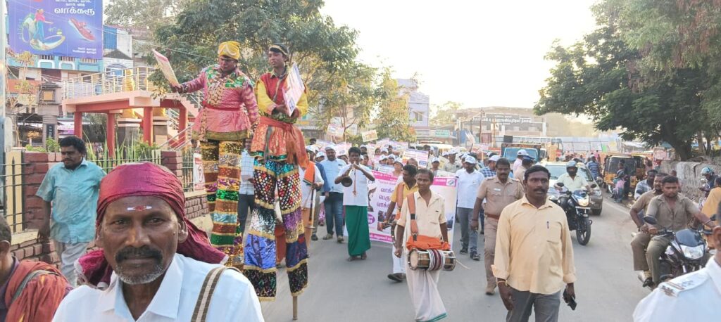 இந்த ஊர்வலம் மேள தாளங்கள் முழங்க பொய்க்கால் குதிரை ஆட்டங்களுடன் வாக்காளராக இருப்பதில் பெருமிதம் கொள்ளுங்கள் வாக்களிக்க தயாராகுங்கள், வாக்கு விற்பனைக்கு அல்ல, 100% தவறாமல் வாக்களிப்போம் போன்ற வாசகங்கள் அடங்கிய பதாகைகளை கையில் ஏந்தியவாறு பொதுமக்களுக்கு துண்டு பிரசுரங்கள் வழங்கி விழிப்புணர்வை ஏற்படுத்தினர்.