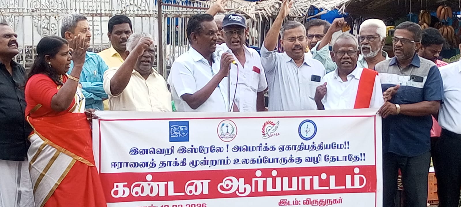 ஈரான் மீது அமெரிக்கா மற்றும் இஸ்ரேல் ஆகிய நாடுகள் போர் தொடுத்ததை கண்டித்து விருதுநகர் தேச பந்து மைதானத்தில் நேற்று மாலை அகில இந்திய சமாதான ஒருமைப்பாட்டு கழகம், தமிழ்நாடு கலை இலக்கிய பெருமன்றம்,தமிழ்நாடு முற்போக்கு எழுத்தாளர் கலைஞர்கள் சங்கம் இந்திய கலாச்சார நட்புறவு கழகம் சார்பில் கண்டன ஆர்ப்பாட்டம் நடைபெற்றது.
