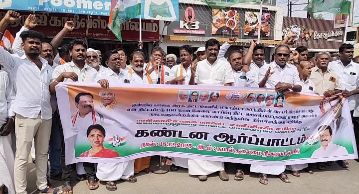 தொடர்ந்து மகாத்மாகாந்தி தேசிய ஊரக வேலைவாய்ப்பு உறுதி திட்டத்தின் பெயரை வளா்ந்த பாரத ஊரக வேலைவாய்ப்பு மற்றும் வாழ்வாதார உறுதியளிப்பு என்று மாற்றுவதற்கு, சட்ட மசோதா நாடாளுமன்றத்தில் அறிமுகம் செய்யப்பட்டதற்கு எதிர்ப்பு தெரிவித்தனர். மேலும் மகாத்மா காந்தியின் பெயர் இருக்கக்கூடாது என திட்டமிட்டு மத்திய அரசு நூறு நாள் வேலை வாய்ப்பு திட்ட செயல்பாட்டினை மாற்றி அமைப்பதற்கும் , இதற்கான தீர்மானத்தை நாடாளுமன்றத்தில் நிறைவேற்றியதற்கும் எதிர்ப்பு தெரிவித்தும் கண்டன கோஷங்களை எழுப்பினர்