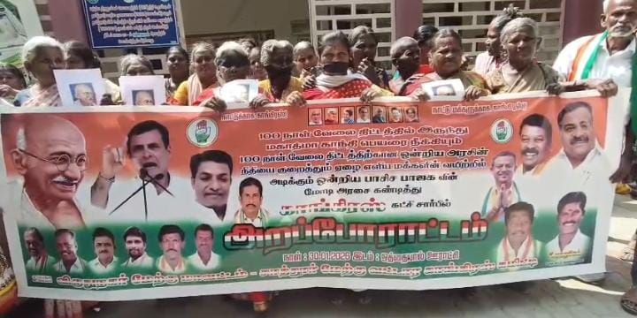 மகாத்மா காந்தி 100 நாள் வேலை வாய்ப்பு திட்ட பெயர் மாற்றத்தை கண்டித்து மத்திய அரசை கண்டித்து தமிழக முழுவதும் காங்கிரஸ் கட்சியினர் பல்வேறு இடங்களில் போராட்டம் நடத்தி வருகின்றனர்.