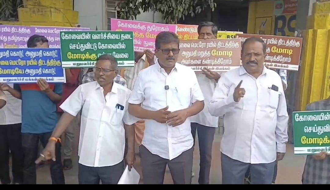 கோவை, மதுரை மெட்ரோ ரயில் திட்ட அறிக்கையை மத்திய அரசு திருப்பி அனுப்பியுள்ளது. இதற்கு பல்வேறு அமைப்பினரும் கண்டனம் தெரிவித்து வருகின்றனர். இதன் ஒரு பகுதியாக கோவை மெட்ரோ ரயில் திட்டம் ரத்து செய்யப்பட்டதை கண்டித்து, கோவை கலெக்டர் அலுவலகம் அருகேயுள்ள பிஎஸ்என்எல் அலுவலகம் முன்பு மறுமலர்ச்சி மக்கள் இயக்கத்தினர் ஆர்ப்பாட்டம் நடத்தினர்.