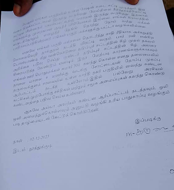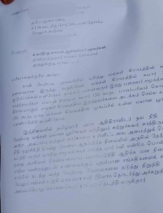சமூக விரோதிகளுக்கு ஆதரவாக செயல்படுவதோடு கிராம மக்களிடம் இச்சம்பவத்திற்காக மொத்தமாக ₹9 லட்சம் பேரம் பேசி முடித்துவிட்டதாகக் கூறி பொதுமக்களையும் பாதிக்கப்பட்ட மக்களையும் அவமதிக்கும் விதமான செயல்களில் ஈடுபட்டு வரும் ஓட்டப்பிடாரம் சட்டமன்ற உறுப்பினர் சண்முகையாவை கண்டித்து கண்டன ஆர்ப்பாட்டத்திற்கு அனுமதிக்கோரி கிராம மக்கள் மனு.!
