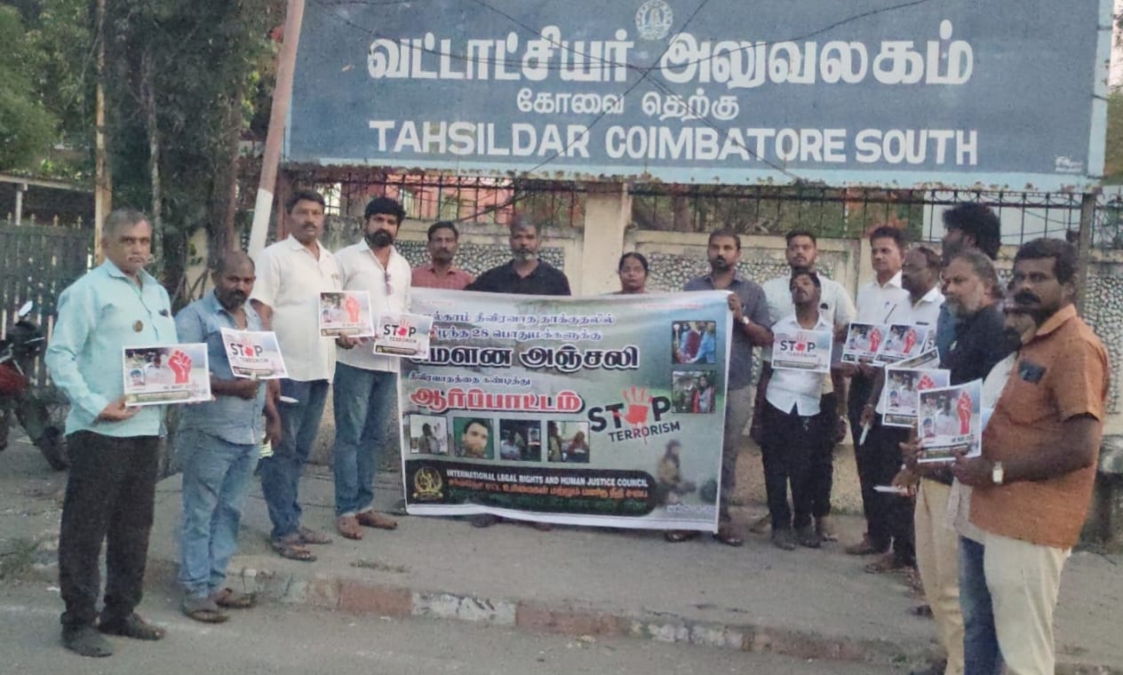 கோவையில் சர்வதேச சட்ட உரிமைகள் மற்றும் மனித நீதி சபை அமைப்பின் சார்பில் காஷ்மீர் பஹல்காம் தீவிரவாத தாக்குதலில் உயிரிழந்த 28 பொதுமக்களுக்கு செஞ்சிலுவை சங்கம் முன்பு மௌன அஞ்சலி செலுத்தியும், மெழுகு பற்றி ஏற்றியும், தீவிரவாத தாக்குதலை கண்டித்து ஆர்ப்பாட்டம் நடைபெற்றது.