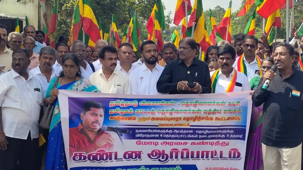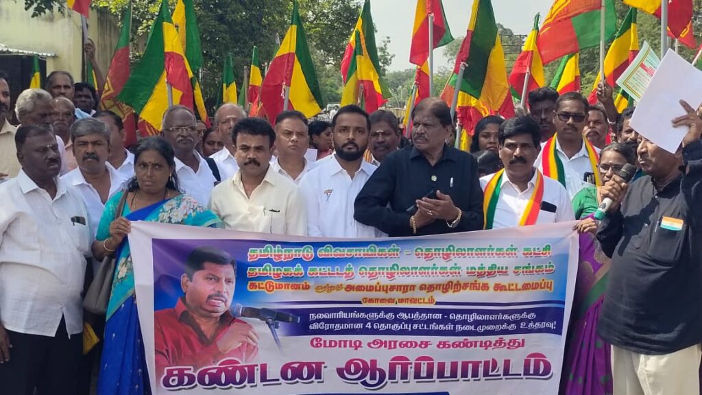 தமிழ்நாடு விவசாயிகள் தொழிலாளர் கட்சி மற்றும் தமிழகம் கட்டடத் தொழிலாளர்கள் மத்திய சங்கம் கட்டுமானம் மற்றும் அமைப்புசாரா தொழிற்சங்க கூட்டமைப்பு சார்பில் கோவை தெற்கு வட்டாட்சியர் அலுவலகம் முன்பு மத்திய அரசை கண்டித்து கண்டன ஆர்ப்பாட்டத்தில் 50-க்கும் மேற்பட்டோர் ஈடுபட்டனர்.