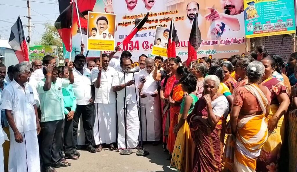 சாத்தூர் அருகே உள்ள வெங்கடாசலபுரத்தில் திமுக சார்பில் மகாத்மா காந்தி தேசிய ஊரக வேலை வாய்ப்பு திட்டத்திற்கு ரூ.4034 கோடி வழங்க மறுக்கும் மத்திய அரசை கண்டித்து கண்டன ஆர்ப்பாட்டம் நடைபெற்றது..
