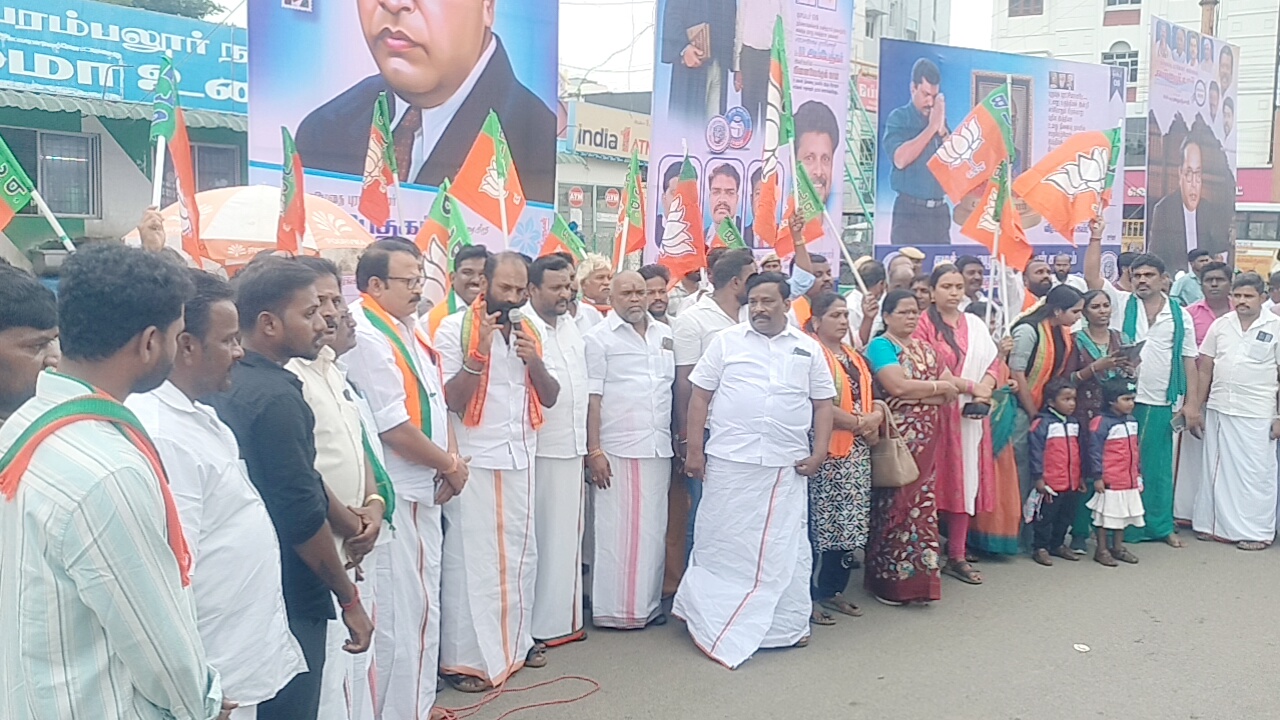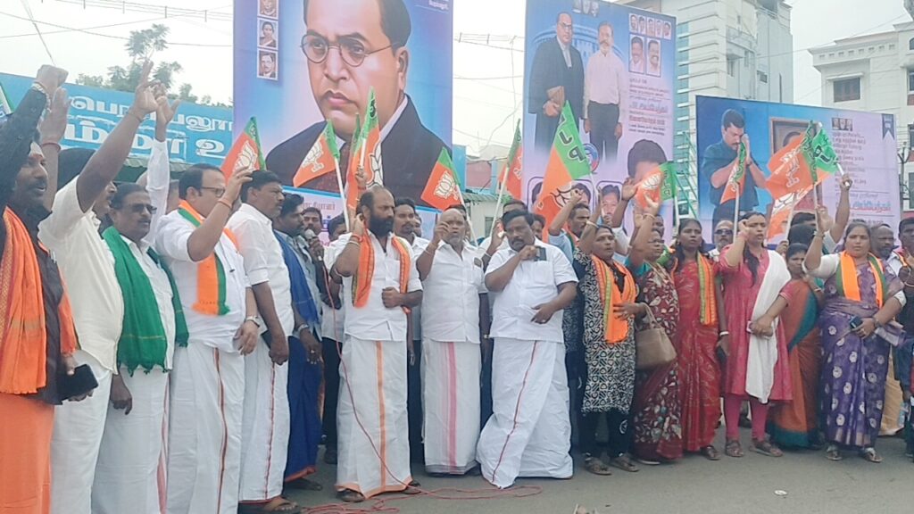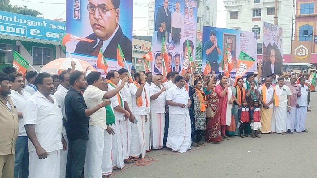 திருப்பரங்குன்றத்தில் கார்த்திகை தீபம் ஏற்றுவது தொடர்பான சர்ச்சையில் பாரதிய ஜனதா கட்சியின் மாநிலத் தலைவர் நைனார் நாகேந்திரன் மீது வழக்கு பதிவு செய்து கைது செய்ததை கண்டித்து பாரதிய ஜனதா கட்சியின் சார்பில் பெரம்பலூர் புதிய பேருந்து நிலையத்தில் தமிழக அரசை கண்டித்து பெரம்பலூர் மாவட்ட தலைவர் முத்தமிழ்செல்வன் தலைமையில் கண்டன ஆர்ப்பாட்டம் நடைபெற்றது.