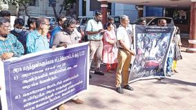 சட்டப்போராட்டக் குழுவின் தலைவர் மருத்துவர் பெருமாள் பிள்ளை தலைமையில் நடந்த போராட்டத்தில் கரோனா பேரிடரில் பணியாற்றி உயிரிழந்த அரசு மருத்துவர் விவேகானந்தன் மனைவி திவ்யா மற்றும் குழந்தைகள் உட்பட ஏராளமான அரசு மருத்துவர்கள் பங்கேற்றனர். அப்போது அரசு மருத்துவர்கள் கூறியதாவது: