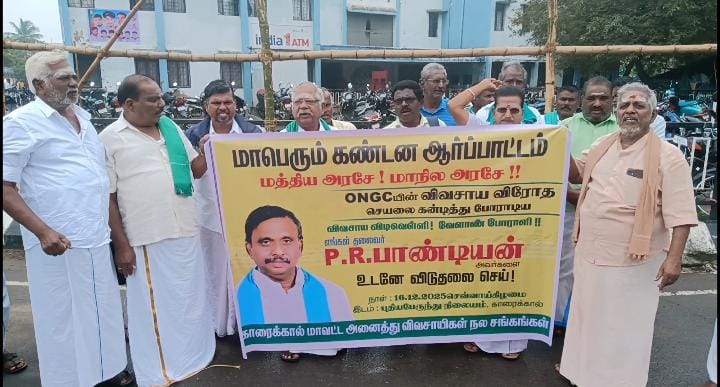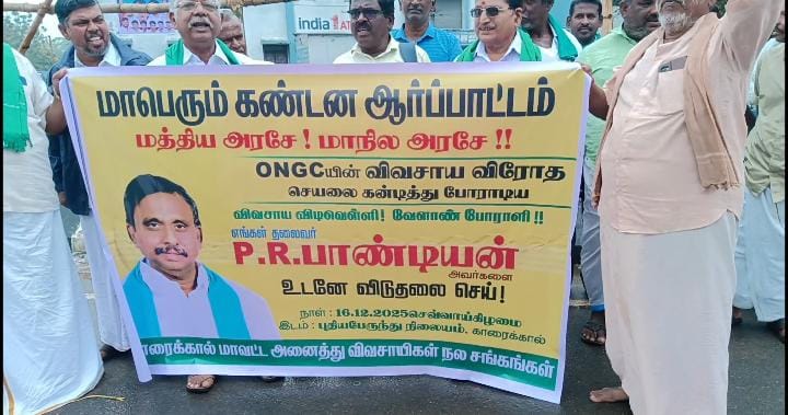 இந்த நிலையில் கைது செய்த பி.ஆர்.பாண்டியனை விடுதலை செய்ய வேண்டும் என்றும் ஓ.என்.ஜி.சி நிறுவனத்தை கண்டித்தும் காரைக்கால் மாவட்டத்தில் அனைத்து விவசாயிகள் நல சங்கங்கள் சார்பில் புதிய பேருந்து நிலையம் அருகே விவசாயிகள் கண்டன ஆர்ப்பாட்டத்தில் ஈடுபட்டனர். அப்பொழுது பி.ஆர். பாண்டியன் மீது போடப்பட்ட வழக்கை தமிழக அரசு உடனடியாக ரத்து செய்து விடுதலை செய்ய வேண்டும் என்று விவசாயிகள் கண்டன கோஷங்கள் எழுப்பி ஆர்ப்பாட்டத்தில் ஈடுபட்டனர்.