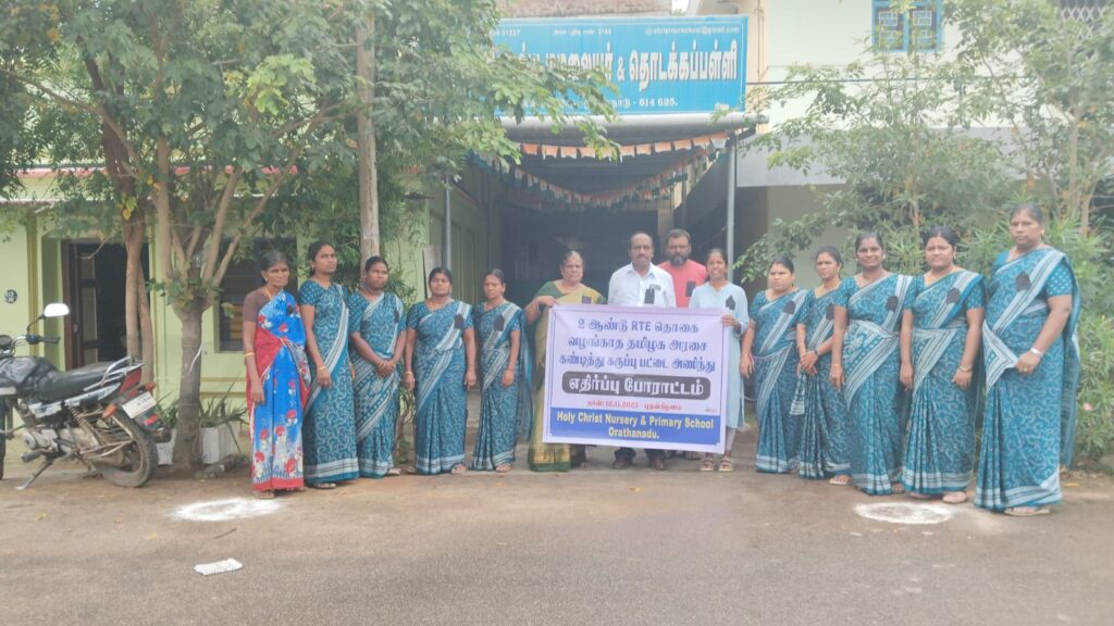 தஞ்சாவூர் மாவட்டம் ஒரத்தநாடு ஹோலி கிரைஸ்ட் தனியார் பள்ளி சார்பாக ஆர்.டி.இ நிதியினை உடனடியாக தமிழக அரசு வழங்கிட வலியுறுத்தி கருப்பு பேட்ச் அணிந்து கண்டன போராட்டத்தை தெரிவித்தனர்.