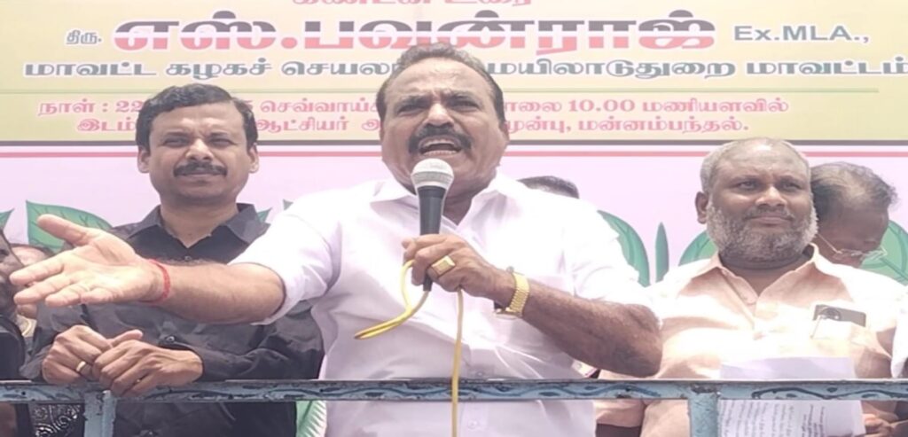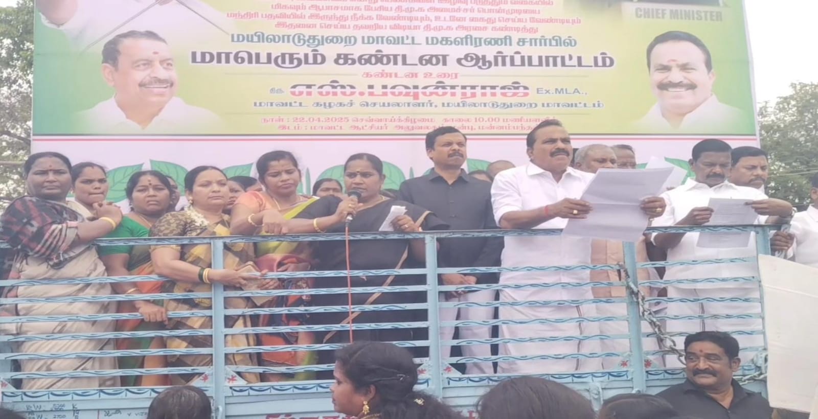 தொடர்ந்து மாவட்ட மகளிர் அணி செயலாளரும் , அதிமுகவின் தலைமை செயற்குழு உறுப்பினருமான மா சக்தி தலைமையில் நடைபெற்ற இந்த ஆர்ப்பாட்டத்தில் சிறப்பு அழைப்பாளராக மயிலாடுதுறை மாவட்ட கழக செயலாளர் எஸ் பவுன்ராஜ் கலந்துகொண்டு கண்டன உரையாற்றினார்.
