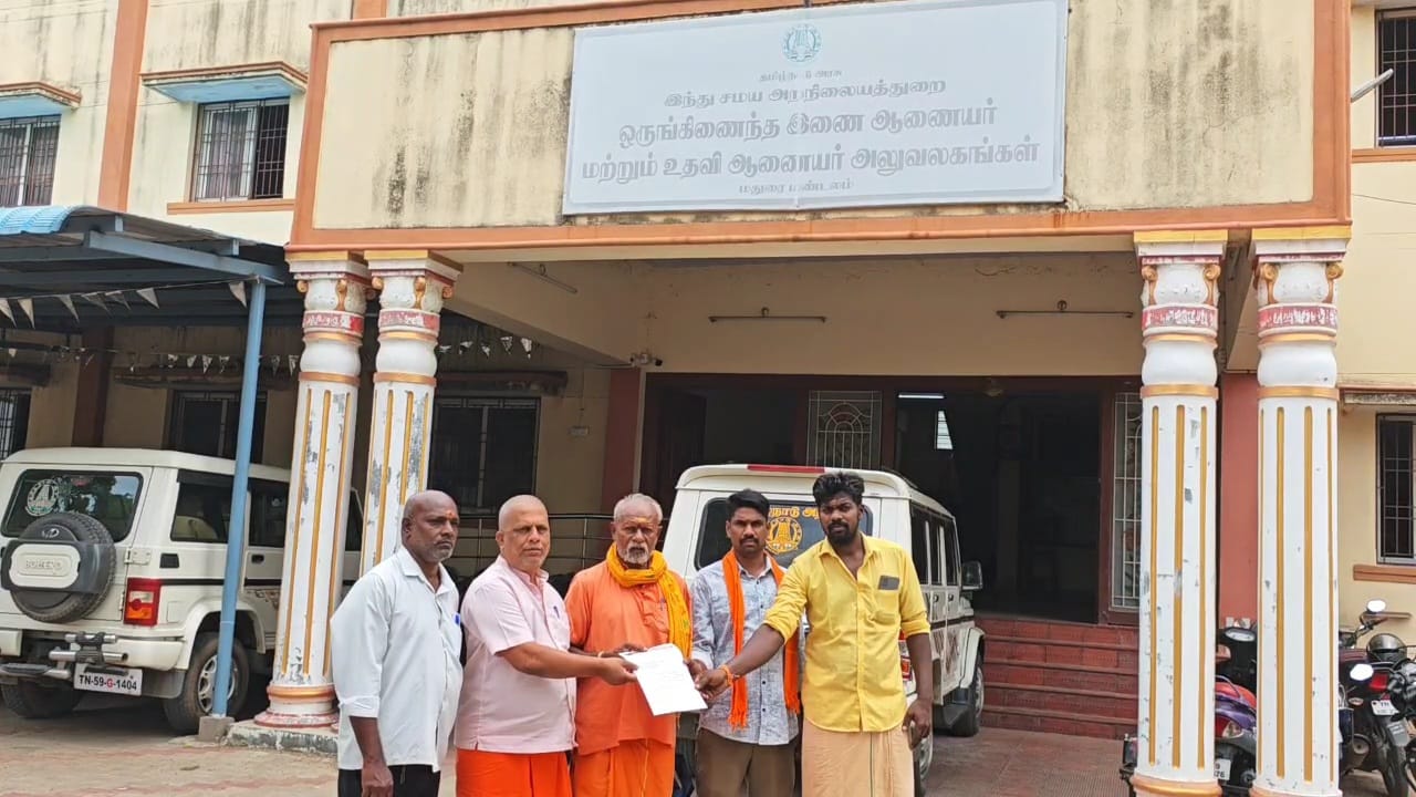 மதுரை எல்லீஸ் நகர் பகுதியில் உள்ள இந்து அறநிலையத்துறை அலுவலகத்தில் அகண்ட இந்து ராஷ்டிரா அமைப்பின் நிறுவனர் கருணாநிதி தலைமையில் மனு அளித்தனர்.