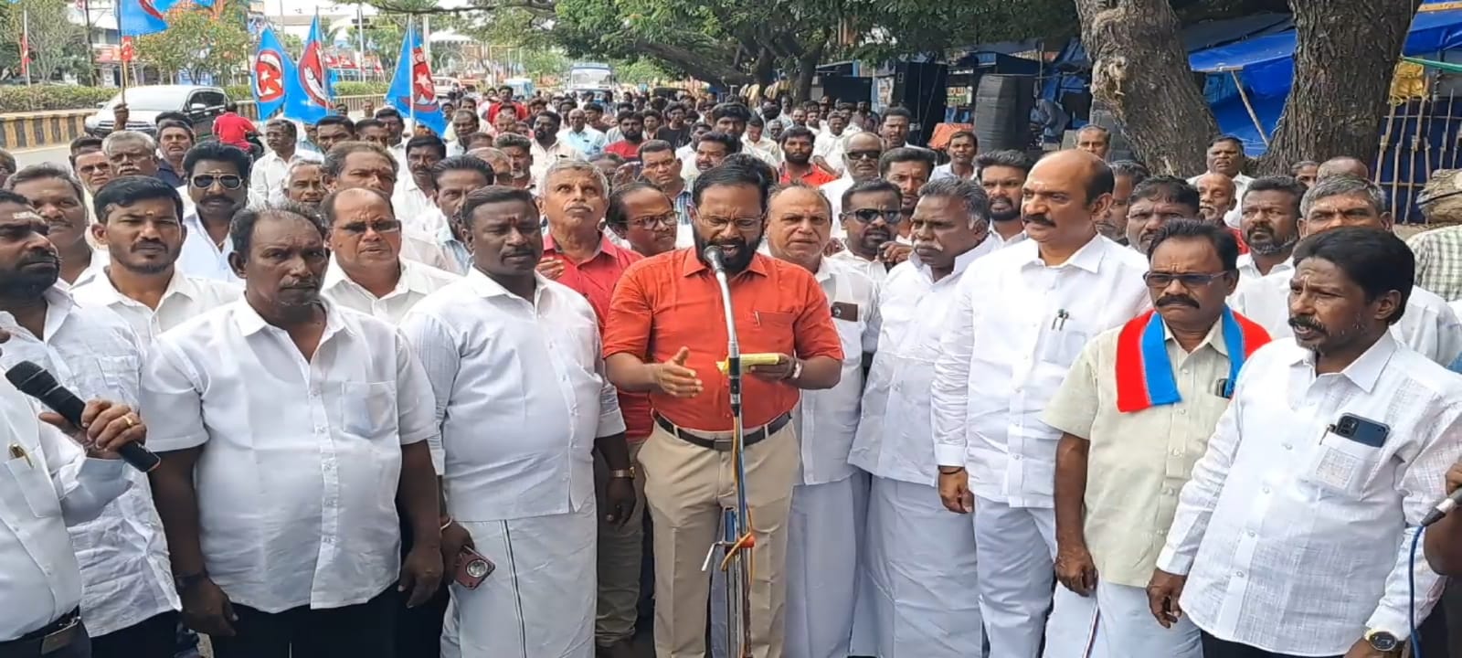 சட்டமன்ற காங்கிரஸ் தலைவர் வைத்தியநாதன் எம்எல்ஏ ஆர்ப்பாட்டத்தை துவக்கி வைக்க தமிழ் மீனவர் விடுதலை வேங்கைகள் அமைப்பாளர் மங்கையர் செல்வன்,