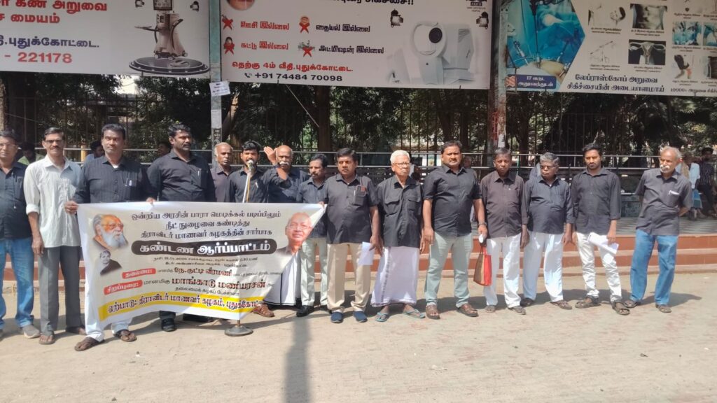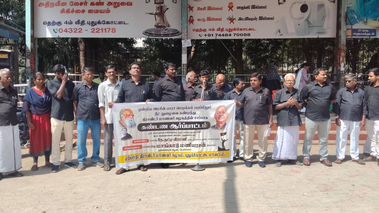 மருத்துவத் துணைப் படிப்புகளில் நுழைவுத் தேர்வை கொண்டு வரும் ஒன்றிய அரசை கண்டித்து புதுக்கோட்டை மாவட்டத் திராவிடர் கழக மாணவரணி சார்பில் புதுக்கோட்டை அண்ணா சிலை அருகில் கண்டன ஆர்ப்பாட்டம் நடைபெற்றது.