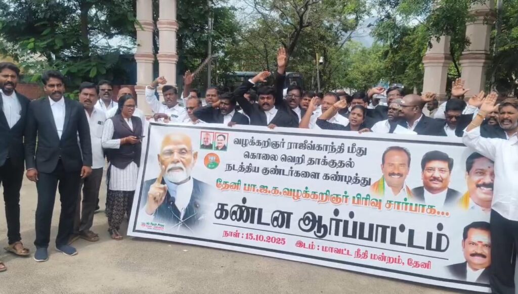 தேனி ஒருங்கிணைந்த நீதிமன்ற வளாகம் முன்பு நடைபெற்ற இந்த ஆர்ப்பாட்டத்தில் பாஜக வழக்கறிஞர் பிரிவை சேர்ந்த வழக்கறிஞர்கள் ஒரு நாள் நீதிமன்ற புறக்கணிப்பில் ஈடுபட்டு ஆர்ப்பாட்டத்தில் ஈடுபட்டனர்