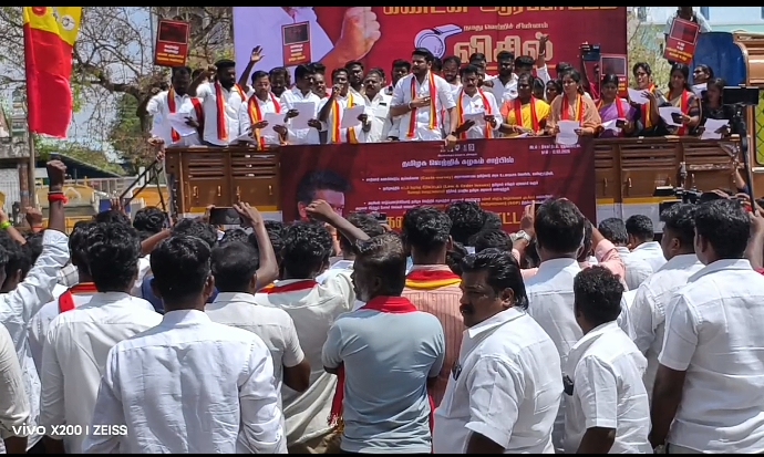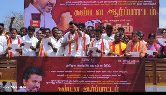 ஆர்ப்பாட்டத்திற்கு மாவட்ட தலைவர் பர்வேஸ் தலைமை வகித்தார். இதில் 300க்கும் மேற்பட்ட தமிழக வெற்றி கழகத்தினர் கையில் பதாகைகளோடு அரசுக்கு எதிராக கோஷங்களை எழுப்பினர்.