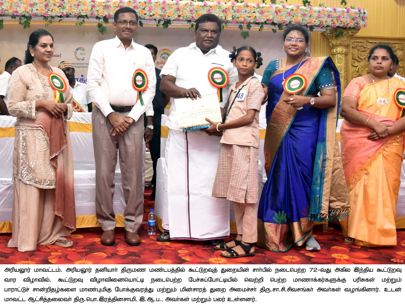 அரியலூர் மாவட்டம், அரியலூர் என் ஜெ மஹாலில் திருமண மண்டப த்தில் கூட்டுறவுத் துறையின் சார்பில் “கூட்டுறவு தொழில் முனைவு மூலம் இளைஞர்கள், பெண்கள் மற்றும் பலவீனமான துறைகளை(கைவினைப்பொருட்கள், கைத்தறி, தொழிலாளர், மீன்வளம் போன்றவை) மேம் படுத்துதல்” எனும் மையக் கருத்துடன் நடைபெற்ற 72-வது அகில இந்திய கூட்டுறவு வார விழாவினை போக்குவரத்து மற்றும் மின்சாரத் துறை அமைச்சர் சா.சி.சிவசங்கர் துவக்கி வைத்து, 384 பயனாளிகளுக்கு ரூ.3.29 கோடி மதிப்பில் பயிர்கடனுதவிகளும், 133 பயனாளிகளுக்கு ரூ.54 இலட்சம் மதிப்பில் கால்நடைப் பராமரிப்பு கடனுதவிகளும், 54 பயனாளி களுக்கு ரூ.5.59 கோடி மதிப்பில் மகளிர் சுய உதவிக்குழு கடனுதவிகளும், 01 மாற்றுத்திறன் பயனாளிக்கு ரூ.50,000 மதிப்பில் கடனுதவிகளும், 02 பயனாளி களுக்கு ரூ.2 இலட்சம் மதிப்பில் தாட்கோ கடனுதவிகளும், 02 பயனாளிகளுக்கு ரூ.1.5 இலட்சம் மதிப்பில் சிறு வணிகக் கடனு தவிகளும் என மொத்தம் 576 பயனாளிகளுக்கு ரூ.9.46 கோடி மதிப்பீட்டில் நலத்திட்ட உதவிகளை,மாவட்ட கலெக்டர் பொ.இரத்தினசாமி முன்னிலை யில்வழங்கி சிறப்புரை