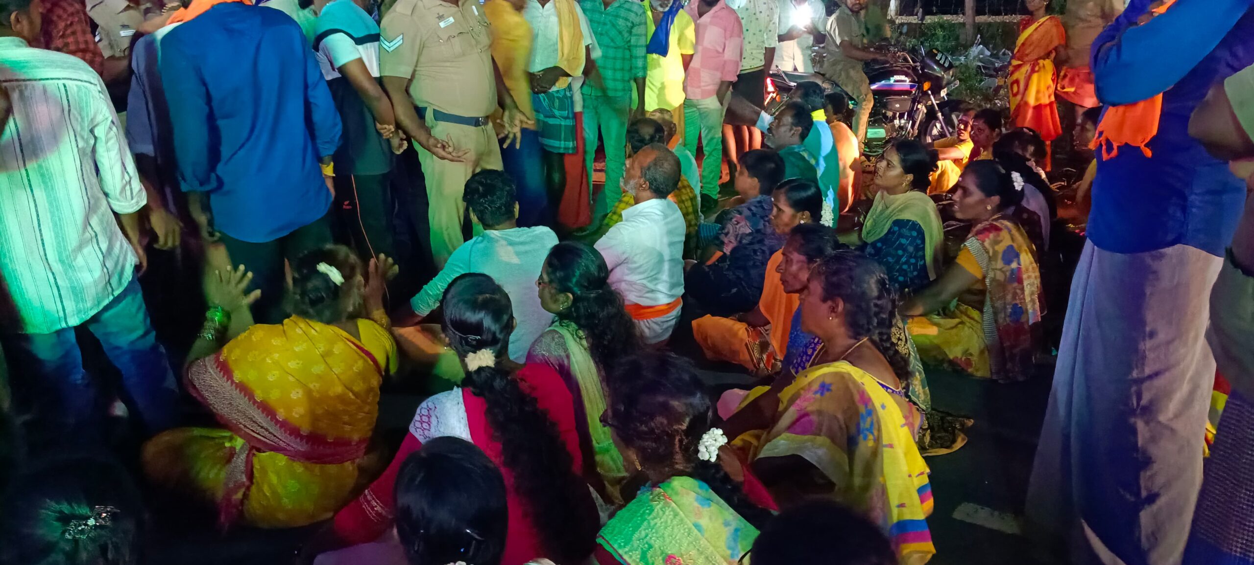 இதையடுத்து கம்பம் தெற்கு போலீசார் நேற்று இரவு பாடல்களின் சத்தத்தை கன்ரோல் செய்யும் ஆம்ப்ளிஃபையர் பெட்டியை பறிமுதல் செய்து போலீஸ் நிலையத்திற்கு எடுத்துச் சென்றனர். போலீசார் ஒலி பெருக்கி பெட்டியை திரும்ப தராததையடுத்து அப்பகுதி மக்கள் போலீசாரை கண்டித்து கம்பம் குமுளி தேசிய நெடுஞ்சாலையில் சாலையில் அமர்ந்து மறியல் போராட்டத்தில் ஈடுபட்டனர்.
