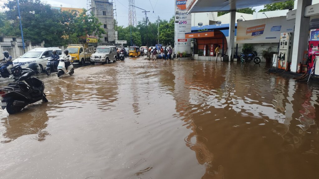 இந்த நிலையில் கோவை ரயில் நிலையம், லங்கா கார்னர், உப்பிலிபாளையம் மேம்பாலம் மற்றும் நீதிமன்றம் அருகே மழைநீர் குளம் போல் தேங்கியதால் பெட்ரோல் பங்க் உள்ளே மழைநீர் சூழ்ந்து உள்ளது.
