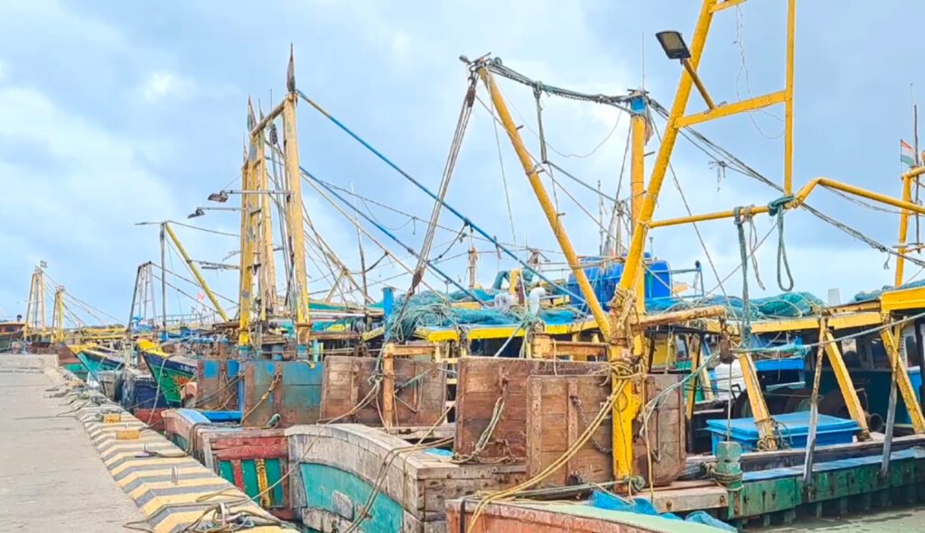 இதனால் மீன் பிடி தொழிலுக்கு செல்லாமல் 300-க்கும் மேற்பட்ட படகுகள் தேங்காய் திட்டு துறைமுகத்தில் நிறுத்தி வைக்கப்பட்டுள்ளது.