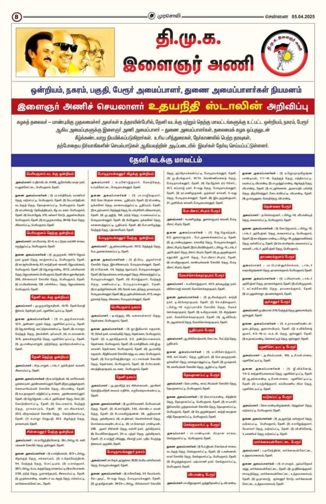 தற்போது, தமிழகம் முழுவதும் திமுக இளைஞரணி சார்பாக, மாநில இளைஞரணி செயலாளரும், துணை முதலமைச்சருமான உதயநிதி ஸ்டாலின், ஒன்றியம், நகரம், பகுதி, பேரூர் அமைப்பாளர்கள், துணை அமைப்பாளர்கள் நியமனம் செய்து வருகிறார். இந்நிலையில், கழகத் தலைவர் முதலமைச்சர் மு.க ஸ்டாலின் உத்தரவின் பேரில்