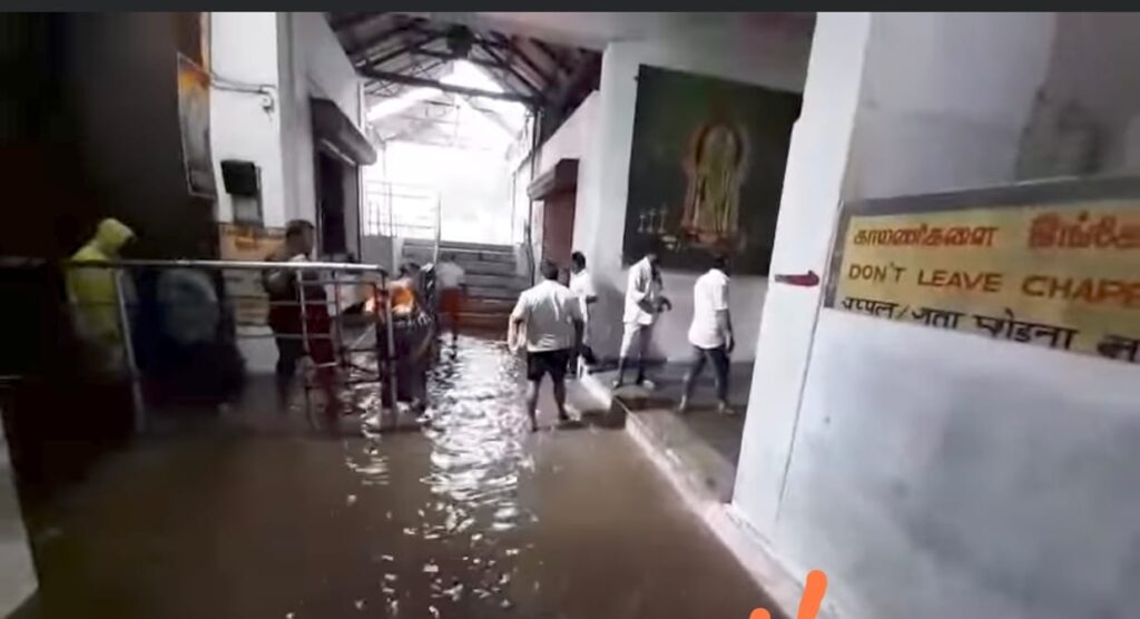 குமரி பகவதி அம்மன் கோயில் தாழ்வான பகுதியில் இருப்பதால், மேடான பகுதியில் பெய்த கனமழை தண்ணீர் பகவதி அம்மன் கோயில் உள்ளே புகுந்தது குளம் போல் காட்சி அளிக்கிறது.