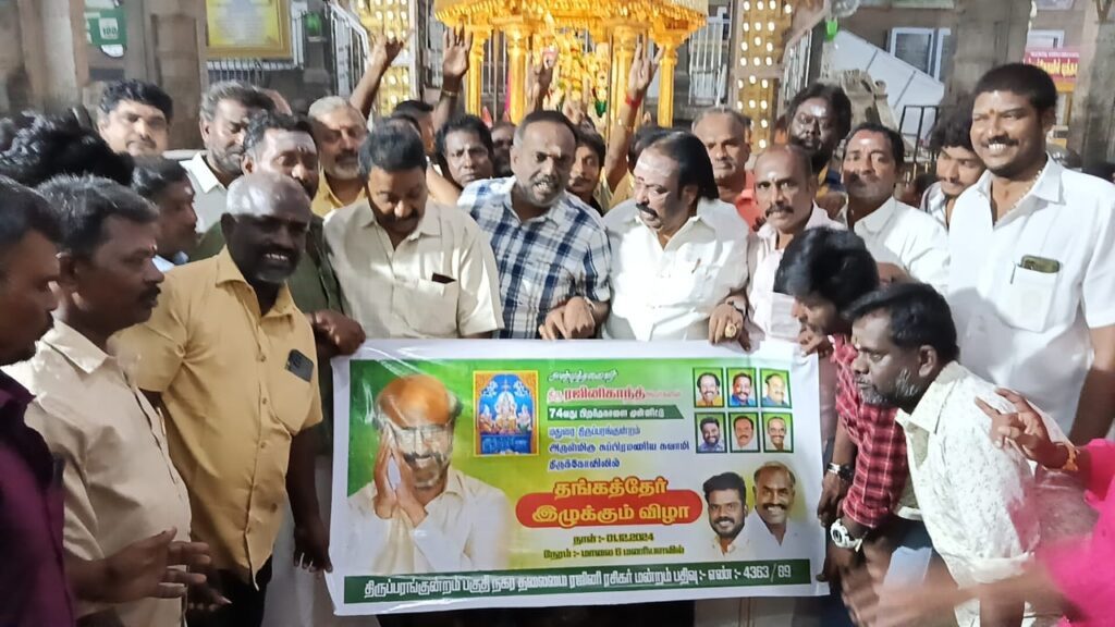 துணைத்தலைவர் அழகர், மாவட்ட செயலாளர் ஜாபர், திருப்பரங்குன்றம் நகரச் செயலாளர் கோல்டன் சரவணன் மற்றும் ரஜினி மன்ற நிர்வாகிகள் ரஜினிகாந்தின் 75 வது பிறந்த தினத்தை முன்னிட்டு வைர விழா ஆண்டாகவும், திரைத்துறைக்கு வந்து 50 ஆண்டுகள் சாதனையாக தங்க விழா ஆண்டாகவும் ரஜினிகாந்த் குடும்பத்துடன் நீண்ட ஆயுளுடன் வாழ சிறப்பு பிரார்த்தனையுடன் தங்கரதம் இழுத்து சிறப்பு வழிபாடு செய்தனர்.