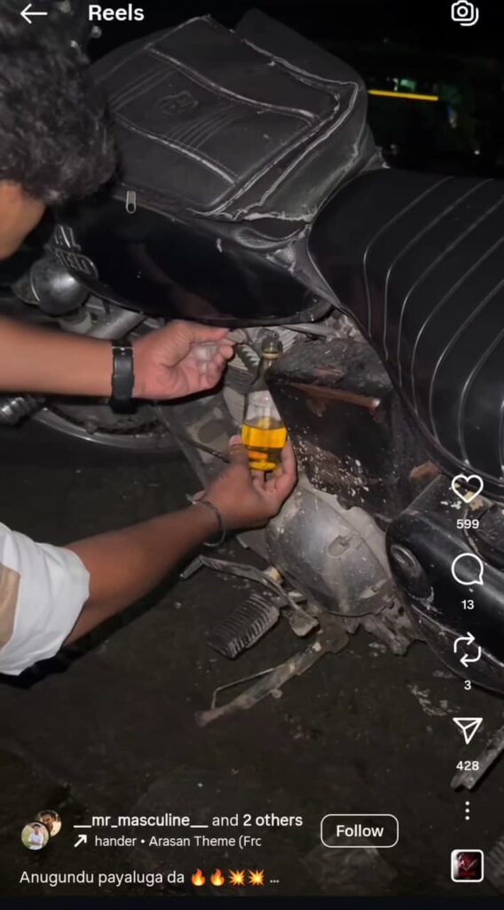 தீபாவளியன்று மதுரை ஆரப்பாளையம் பகுதியில் அணுகுண்டுபட்டாசுகளை மாலையாக அணிந்து அதில் பெட்ரோலை ஊற்றி எரிக்கவைத்த வீடியோவை சில இளைஞர்கள் தங்களது இன்ஸ்டாவில் ரீல்ஸாக பதிவிட்டிருந்தனர்.