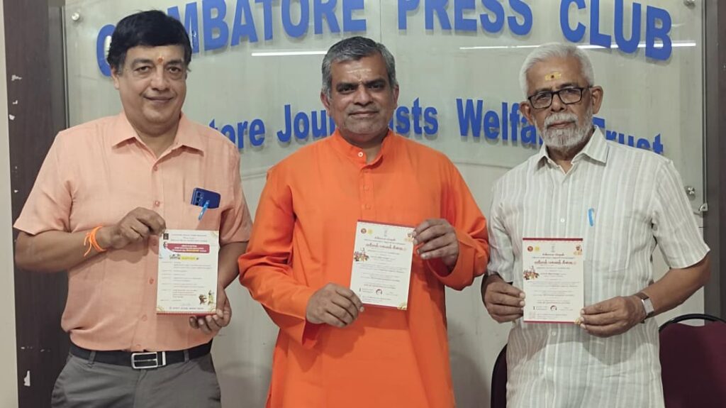 கோவை ஆர்.எஸ் புரம் ஸ்ரீ மாருதி கான சபாவில் வருகிற நவம்பர் 1-ம் தேதி பகவத் கீதை செய்யுள்களின் தமிழாக்க வெளியீட்டு விழா நடைபெறுகிறது. இந்த விழாவில் பேரூர் சிரவை மற்றும் காமாட்சிபுரம் ஆதீனங்கள் கலந்து கொள்கின்றனர்.இது தொடர்பாக செய்தியாளர் சந்திப்பு கோவை பத்திரிக்கையாளர் மன்றத்தில் நடைபெற்றது.