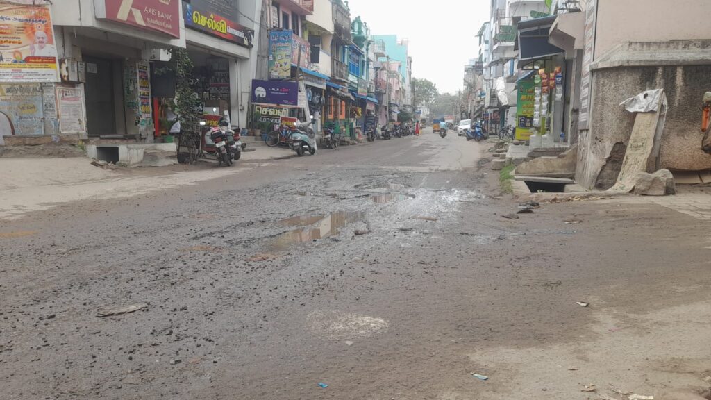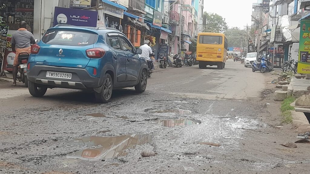 சோழவந்தான் ஜெனகை மாரியம்மன் கோவில் அருகில் வடக்கு ரத வீதி பகுதியில் மழையால் சாலையில் மிகப்பெரிய பள்ளம் ஏற்பட்டு அடிக்கடி விபத்து ஏற்படுவதாக வாகன ஓட்டிகள் பொதுமக்கள் புகார் தெரிவித்திருந்தனர். இந்த நிலையில் கடந்த இரண்டு நாட்களுக்கு முன்பு பெய்த மழை காரணமாக அந்தப் பகுதி சாலையில் மழை நீர் தேங்கி சாலையில் அடுத்தடுத்து பள்ளம் ஏற்பட்டுள்ளது. இதனால் அந்த வழியாக செல்லக்கூடிய இருசக்கர வாகனங்கள் நான்கு சக்கர வாகனங்கள் மற்றும் பொதுமக்கள் என அனைவரும் பல்வேறு சிரமங்களுக்கு ஆளாகி வருகின்றனர்.