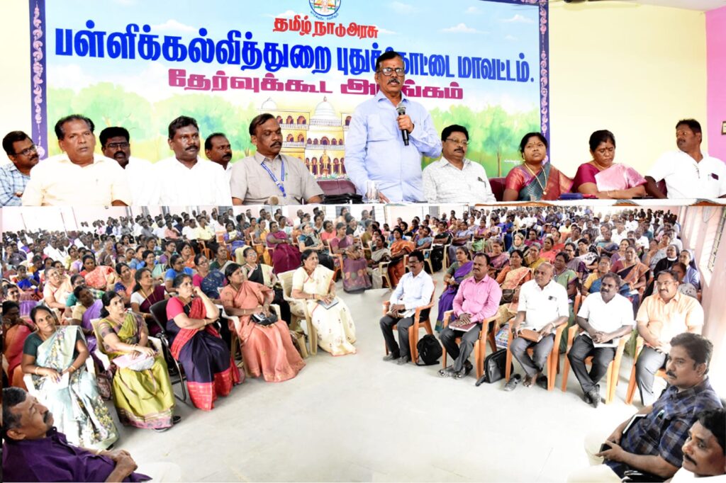 புதுக்கோட்டை முதன்மைக்கல்வி அலுவலக வளாகத் தேர்வுக்கூட அரங்கில் புதுக்கோட்டை மாவட்டத்தில் உள்ள அரசு மற்றும் அரசு உதவி பெறும் உயர்நிலை, மேல்நிலைப் பள்ளிகளின் தலைமை யாசிரியர்களுக்கான ஆய்வுக்கூட்டம் நடைபெற்றது.