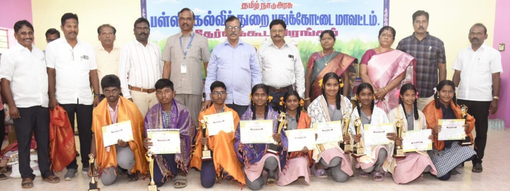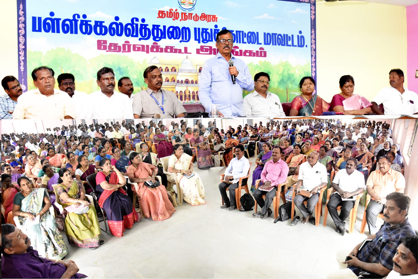 கூட்டத்திற்கு வந்திருந்த அனைவரையும் முதன்மைக்கல்வி அலுவலர் கூ.சண்முகம் வரவேற்றார். கூட்டத்திற்கு பள்ளிக்கல்வி இயக்குநர் முனைவர் ச.கண்ணப்பன் தலைமை தாங்கி புதுக்கோட்டை மாவட்டத்தில் மாநில அளவில் கலையரசி பட்டம் பெற்ற 3 மாணவிகள், மன்றச் செயல்பாடுகளில் மாநில அளவில் தேர்வு பெற்று மலேசியா கல்விச் சுற்றுலா செல்ல தேர்வாகியுள்ள 9 மாணவர்கள், கலைத்திருவிழாவில் மாநில அளவில் முதல், இரண்டு மற்றும் மூன்றாம் இடம் பிடித்த மாணவர்கள், மாநில, தேசிய அளவில் விளையாட்டு போட்டிகளில் சாதனை புரிந்த மாணவர்கள், தென்னிந்திய அறிவியல் கண்காட்சியில் மாநில அளவில் முதலிடம் பெற்ற மாணவர் ஆகியோருக்கு பொன்னாடை போர்த்தி பாராட்டுகளைத் தெரிவித்து பேசும்போது கூறியதாவது, தலைமையாசிரியர்களாகிய நீங்கள் மற்றும் உங்களுடன் பணிபுரியும் ஆசிரியர்கள் ஆகியோர் பள்ளி அமைந்திருக்ககூடிய கிராமத்திற்கு பள்ளிக்கல்வித்துறையின் பிரதிநிதிகள்.