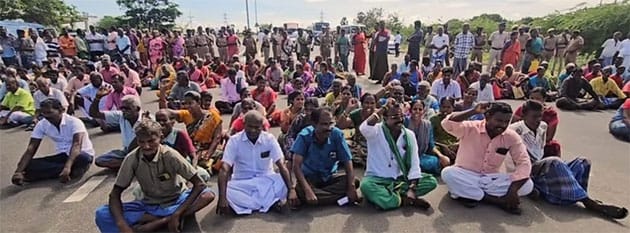 இதற்கிடையே, ஏற்கெனவே திட்டமிட்டபடி இன்று காலை பொட்டலூரணி விலக்கில் திரண்ட கிராம மக்கள், தூத்துக்குடி-திருநெல்வேலி தேசிய நெடுஞ்சாலையில் அமர்ந்து சாலை மறியலில் ஈடுபட்டனர். இதனால், போக்குவரத்து பாதிக்கப்பட்டது.