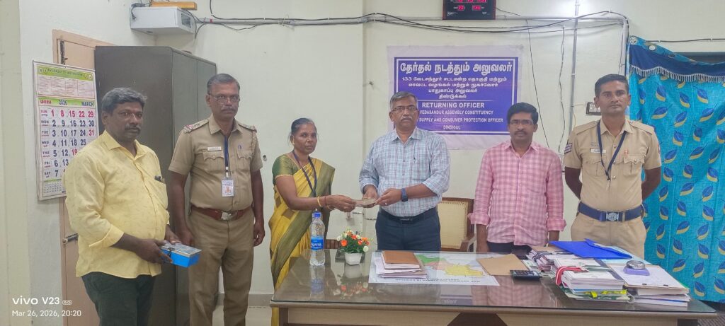 திண்டுக்கல் மாவட்டம் வேடசந்தூர் – அழகாபுரி சாலையில் வெரியம்பட்டி அருகே பறக்கும் படை அலுவலர் கருப்பாயி தலைமையிலான குழுவினர் வாகன சோதனையில் ஈடுபட்டுக் கொண்டிருந்தனர்.